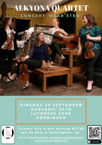 Het engelse Alkyona Kwartet komt dit jaar weer een concert geven in de Lutherse Kerk, op 20 september om 20:15. Dit jaar zetten zij muziek van vrouwelijke componisten in het zonnetje, niet alleen omdat de muziek van deze componisten ondervertegenwoordigd zijn in de programmering van klassieke muziek, maar vooral omdat het zulke geweldige stukken zijn! De vier jonge vrouwen van het strijkkwartet, met Groningse celliste Jobine Siekman, voeren niet alleen de muziek uit maar zullen de stukken ook afwisselen met gesproken citaten van de diverse componisten.